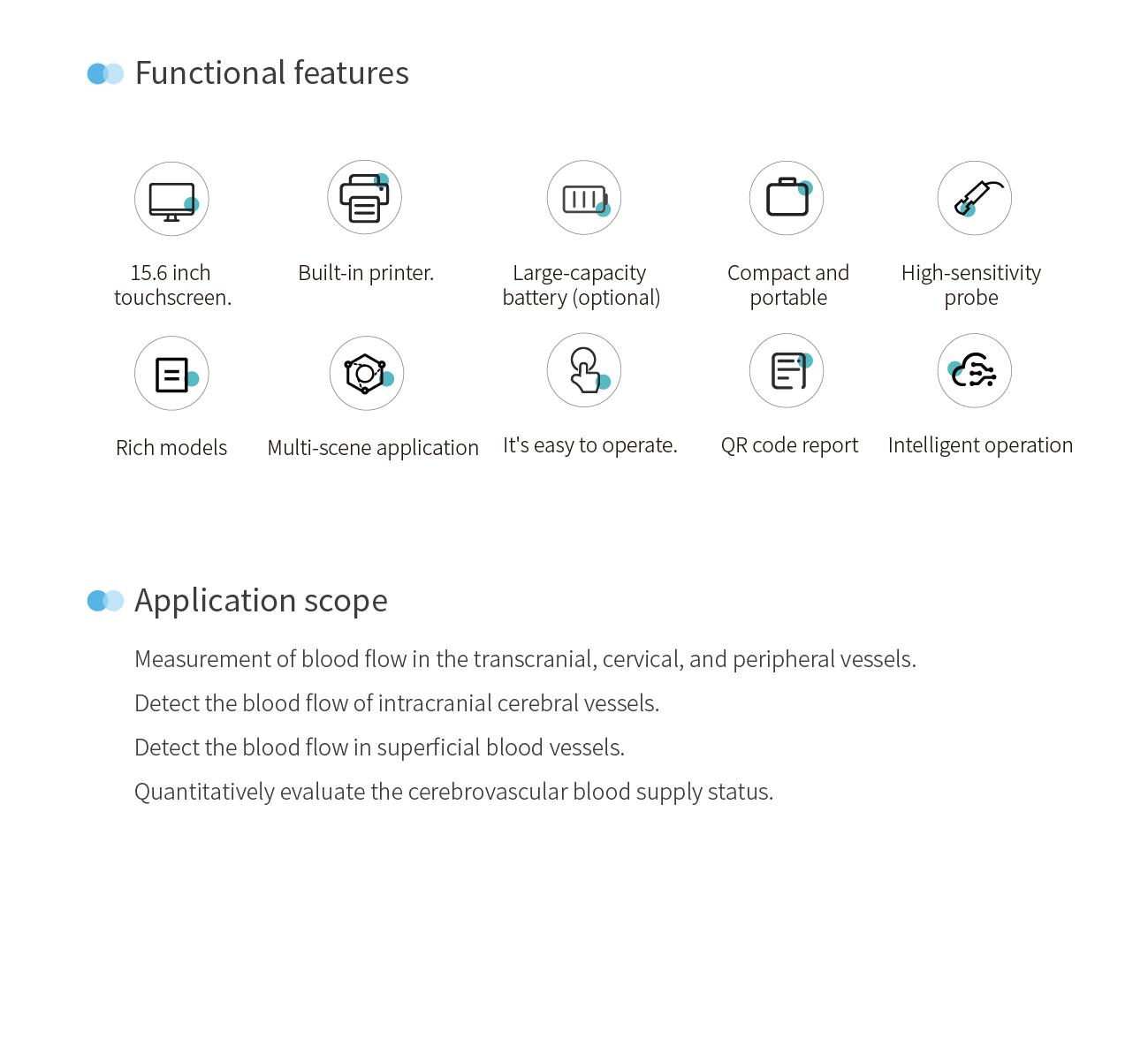 The TCD is equipped with a monitoring probe and probe cover, which can realize monitoring function, mainly used for blood flow measurement of cerebral, cervical, and peripheral vessels.