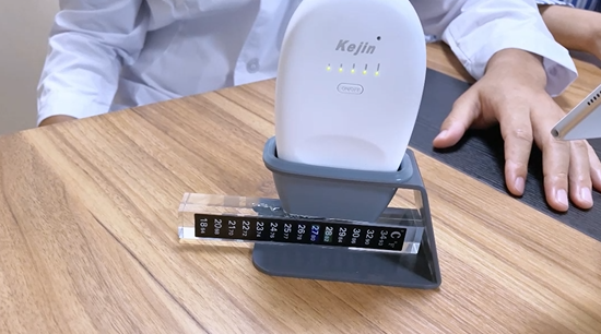 根據(jù)軟件提示使用定位標(biāo)尺標(biāo)記檢測(cè)部位,在儀器探頭上涂抹適量耦合劑。將儀器探頭垂直放置于檢測(cè)部位上,OSTEOKJ7600型號(hào)無(wú)線超聲骨密度儀檢測(cè)橈骨,橈骨在手臂的前臂位置,以指尖作為起點(diǎn),肘關(guān)節(jié)作為終點(diǎn),在前臂外側(cè)1/2處的部位。根據(jù)軟件提示進(jìn)行骨密度檢測(cè)。