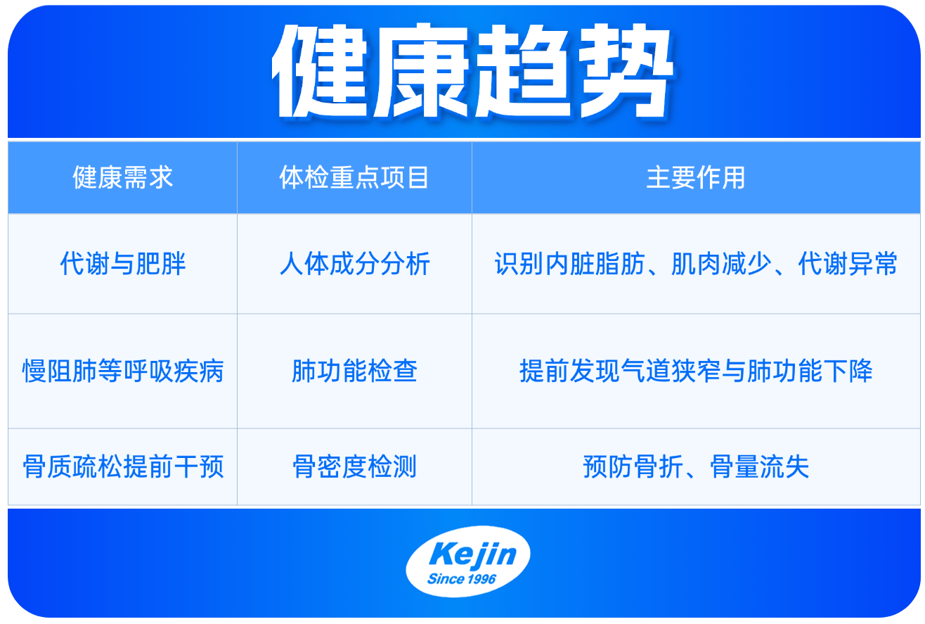 這意味著,我國健康體檢正從“查疾病”走向“查風險、早預(yù)防、重管理”,體檢不再只看體重、血脂,而是需要通過更精細的檢測評估身體構(gòu)成、代謝狀態(tài)、呼吸功能與骨骼健康。